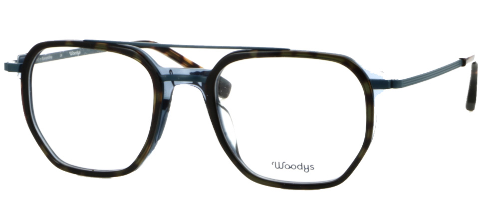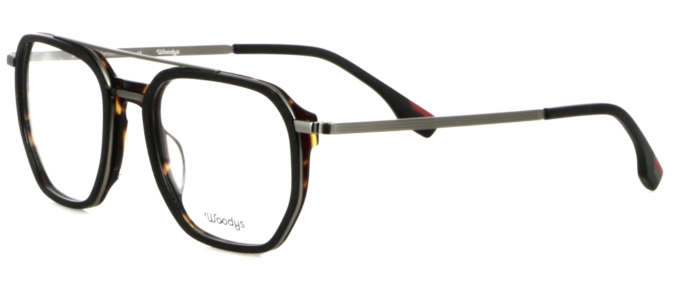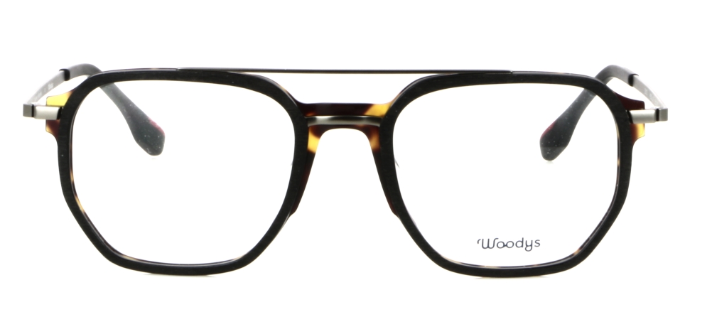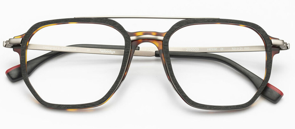 Modello unisex con doppio ponte in materiale combinato: acetato di cellulosa e acciaio.