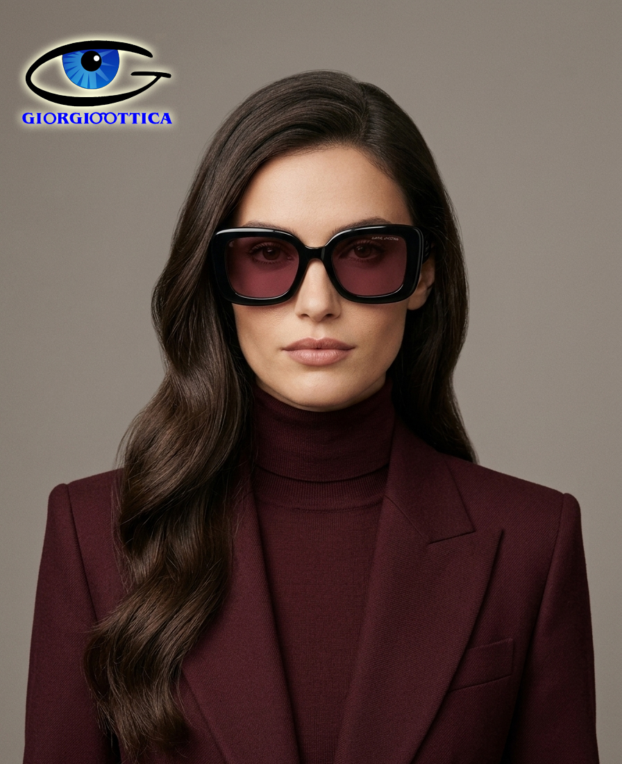 La forma squadrata e audace cattura lo sguardo, mentre le lenti color malva aggiungono un tocco di mistero e calore.